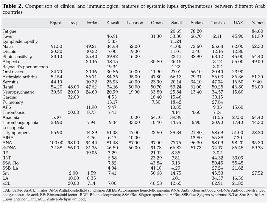 Conclusion: Systemic lupus erythematosus displays several different clinical and serologic characteristics, both among different Arab populations and in comparison to other ethnic groups.
