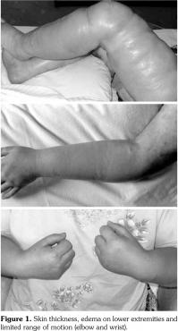 A 46-year-old female patient presented with restricted joint movements, swelling in arms and legs, skin stiffness, and whole-body inflexibility. Her complaints had started five years ago and increased since then. She did not have any vascular condition or symptoms indicative of Raynaud’s phenomenon (evident skin conditions on her face, coldness in her hands, or cyanosis). There were no prominent skin pigment changes, telangiectases, or any distinctive finger appearance with sclerodactyly or ulceration. Upon inspection, significant bilateral skin thickness and edema were found in her lower extremities. Her skin surface was shiny and irregular. Her range of motion (ROM) was limited for the bilateral shoulder, elbow, wrist, hip, knee, and ankle joints (Figure 1). Laboratory analyses showed normal results for hemogram, routine biochemical tests, erythrocyte sedimentation rate and normal extractable nuclear antibody profile. She had normal levels for muscle enzymes, protein, C-reactive protein, anti-nuclear antibody, rheumatoid factor, anti-scleroderma-70, and anti-centromere antibody. Furthermore, radiographs were normal. Doppler ultrasound of the extremities revealed no abnormal findings, except thickness reaching to the subcutaneous tissues. On skin biopsy of the extremities, thickened and enlarged bundles of collagen were found in the dermis. We also found evidences of atrophy in the epidermis, adipocyte entrapment, and non-inflammatory enlargement in the fascia with normal muscle appearance beneath it. Slight accumulations of mucopolysaccharide were identified using the Alcian-blue stain. The patient was identified as having widespread stiff skin syndrome (SSS) as a result of the above- mentioned clinical and pathological findings.