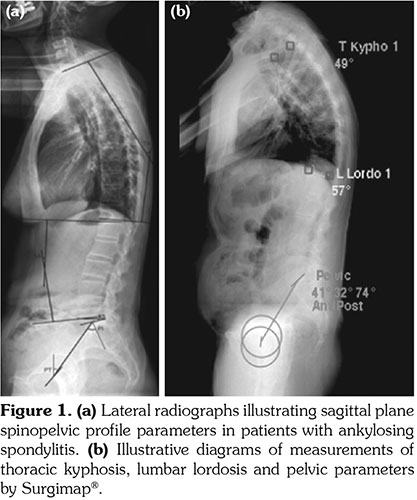 It has been reported that patients with AS had lower pelvic incidence, lumbar lordosis, sacral slope and higher pelvic tilt and sagittal vertical axis when compared to healthy controls.(7,12) Sagittal vertical axis, lumbar lordosis and sacral slope were suggested as predictive factors for the clinical outcomes in AS.(12)