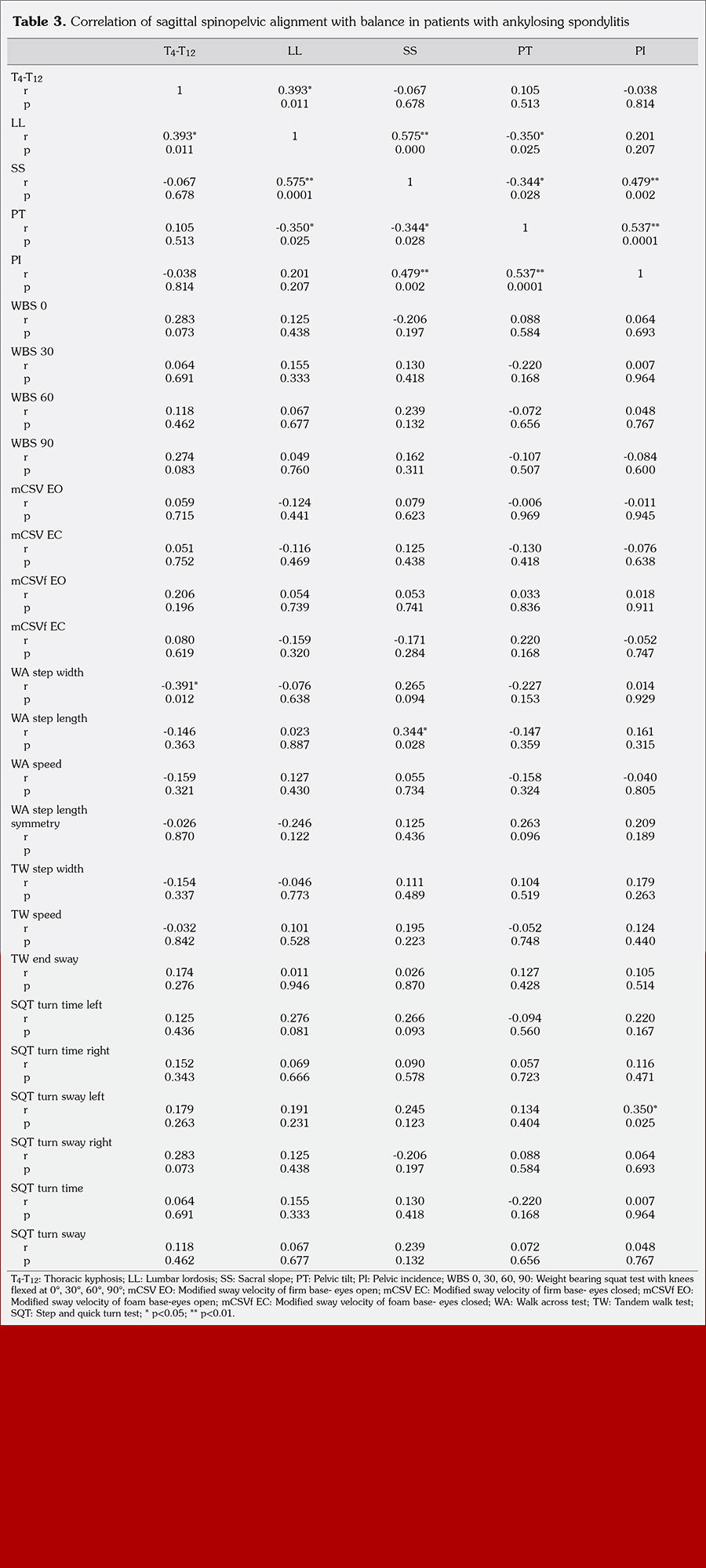 Neither disease activity nor disease duration was associated with the SSA parameters. Our patients had relatively shorter disease duration and lower disease activity compared to the literature. In this study, we would like to point the possibility of balance disorders even in early terms of AS. To our knowledge, no previous study investigated the associations between disease activity, disease duration and SSA parameters in patients AS. Neither pain nor disease activity was significantly correlated with balance and posture in AS, previously.(3,7,8) In order to clarify the association between the disease duration and SSA parameters, further studies with larger sample size and longer duration of disease should be conducted. Moreover, the association of lumbopelvic mismatch with balance in patients with AS has not been reported yet.