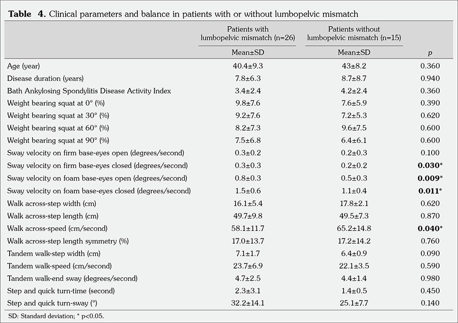 Patients and methods: We enrolled 41 patients (22 males, 19 females; mean age 41.3±8.9 years; range 21 to 57 years) into the study. Sagittal spinopelvic alignment was evaluated measuring thoracic kyphosis, lumbar lordosis, sacral slope, pelvic tilt and pelvic incidence on lateral standing X-rays of the whole spine including the femoral heads. Patients were grouped according to presence of lumbopelvic mismatch (lumbar lordosis- pelvic incidence >10o). Clinical parameters including age, body mass index, pain (Visual Analog Scale), disease activity (Bath Ankylosing Spondylitis Disease Activity Index), and disease duration were recorded. Posture was evaluated measuring tragus-to-wall distance, modified Schober’s test and chest expansion. A computerized pressure plate system (NeuroCom Balance Master®) was used for evaluating static and dynamic balance. Correlations between sagittal spinopelvic alignment parameters and balance were analyzed. Patients with or without lumbopelvic mismatch were compared in terms of balance.