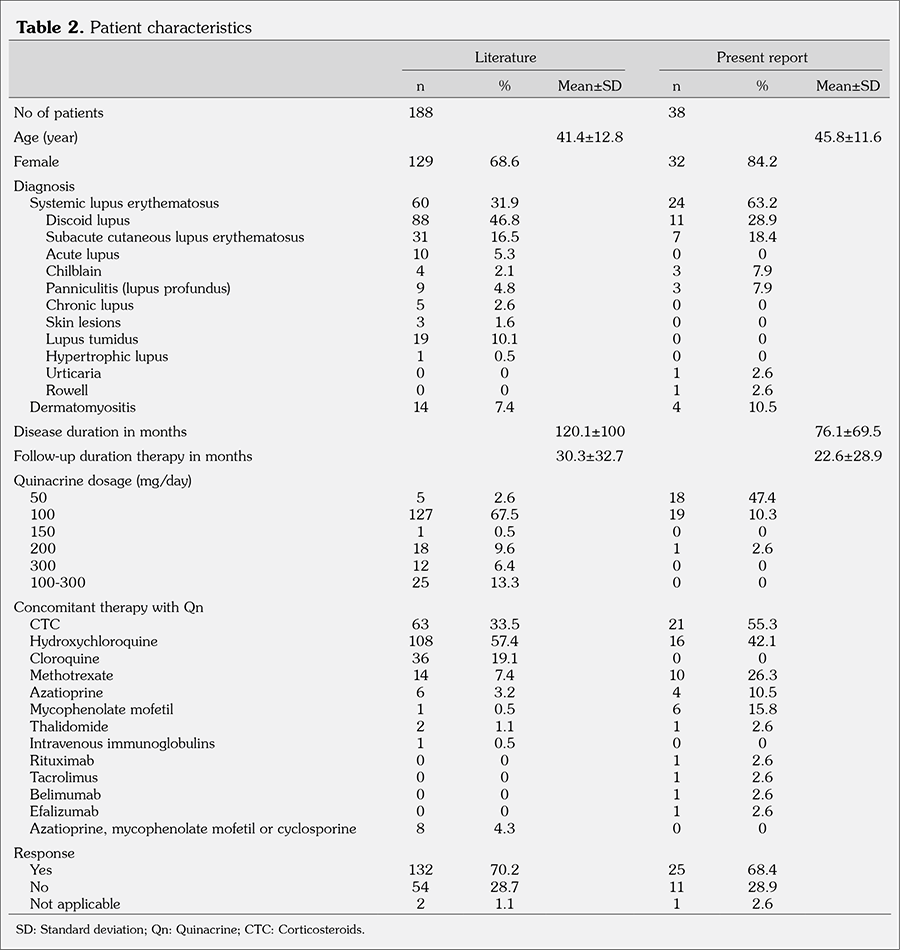 Patients and methods: The study included 38 patients (6 males, 32 females; mean age 45±8 years; range, 23 to 72 years) with systemic lupus erythematosus (SLE), cutaneous lupus or DM who had been treated with Qn. The following data were obtained from the records of each patient: sex, age, diagnosis, duration of the disease, duration of treatment, smoking behavior, antimalarial treatment, concomitant treatment, and clinical indications, as well as Systemic Lupus Erythematosus Disease Activity Index (SLEDAI) and Cutaneous Lupus Erythematosus Disease Area and Severity Index (CLASI) activity before initiation, at the last visit, or when Qn treatment was completed. We carried out a MEDLINE search for previously reported cases that, together with our patients, served as the basis of this report.