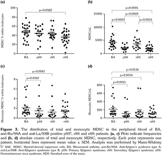 Results: Analysis revealed that the frequency of overall MDSCs increased in RA group (46.5±3.4) compared with nSS group (35.6±3.2; p=0.0322). An increase of absolute count of overall MDSCs was most evident in both RA (4383±456.8) and sSS groups (3890±495.7) compared with pSS (2447±275.1; p=0.0002 and 0.0067) and nSS groups (2025±218.1; p<0.0001 and p=0.0012). The highest absolute count of monocytic MDSCs also manifested in RA group (195.4±39.0), compared with all the other groups (86.0±24.9; p=0.0002 [pSS], 128.5±53.4; p=0.0076 [sSS], 83.7±19.0; p=0.0136 [nSS]).
