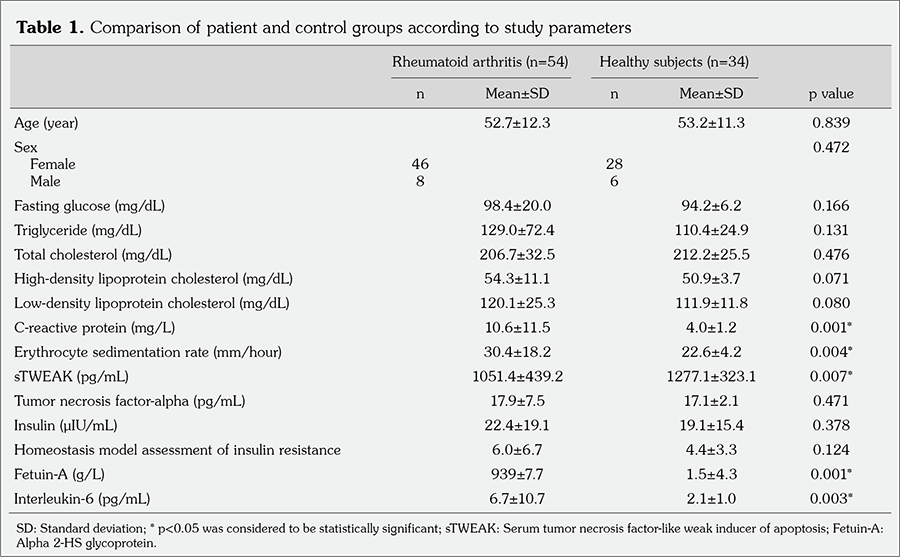 Patients and methods: Fifty-four patients with RA (8 males, 46 females; mean age 52 years; range 40 to 64 years) and 34 healthy controls (6 males, 28 females; mean age 53 years; range 41 to 65 years) were included in the study. The sTWEAK, fetuin-A, insulin, lipid profile and IL-6 concentrations were determined. The HOMA-IR levels were calculated using a calculator. Disease activity score 28 was used to assess the disease activity.