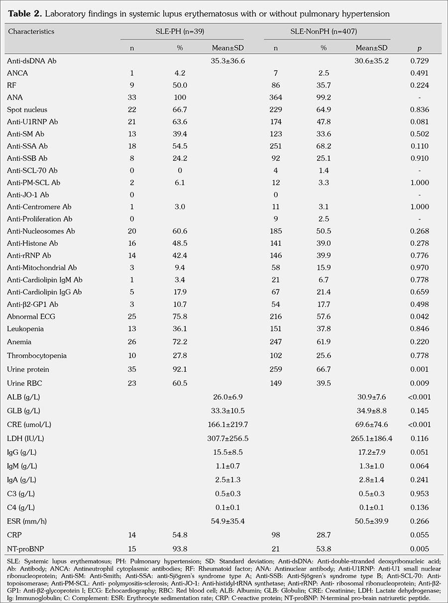 Medical records of 446 patients (46 males, 400 females; mean age 35.1±14.1 years; range, 7 to 73 years) with SLE were collected in the Department of Rheumatology, Fujian Medical University Union Hospital between January 2013 and March 2017 according to Systemic Lupus International Collaborating Clinics (SLICC) 2012 classification criteria.(11) Among them, 39 patients (2 males, 37 females; mean age 38.2±14.9 years; range, 16 to 71 years) passed the SLICC 2012 classification criteria of SLE and the PH criteria previously described and were recruited as test subjects (PH group), while the remaining 407 patients (43 males, 364 females; mean age 34.8±14.0 years; range, 7 to 73 years) were recruited as controls (NonPH group). The PH group consisted of patients with PASP of ≥40 mmHg by echocardiography,(10,12) while the NonPH group consisted of patients with PASP of <40 mmHg. Patients with SLE were excluded if they suffered from diseases that could affect pulmonary artery pressure, including overlapping syndrome, interstitial lung disease, chronic thromboembolic PH, congenital heart diseases, significant valvular disease, chronic obstructive pulmonary disease, and pregnancy. The study protocol was approved by the Fujian Medical University Union Hospital Ethics Committee (No.2018KY015). A written informed consent was obtained from each patient. The study was conducted in accordance with the principles of the Declaration of Helsinki.